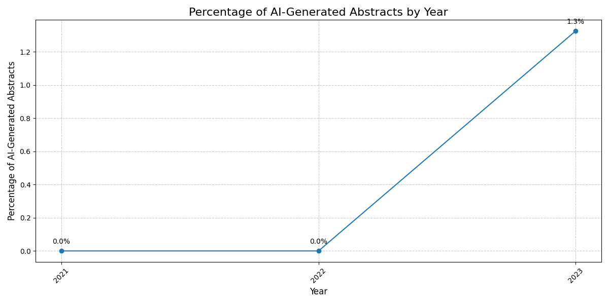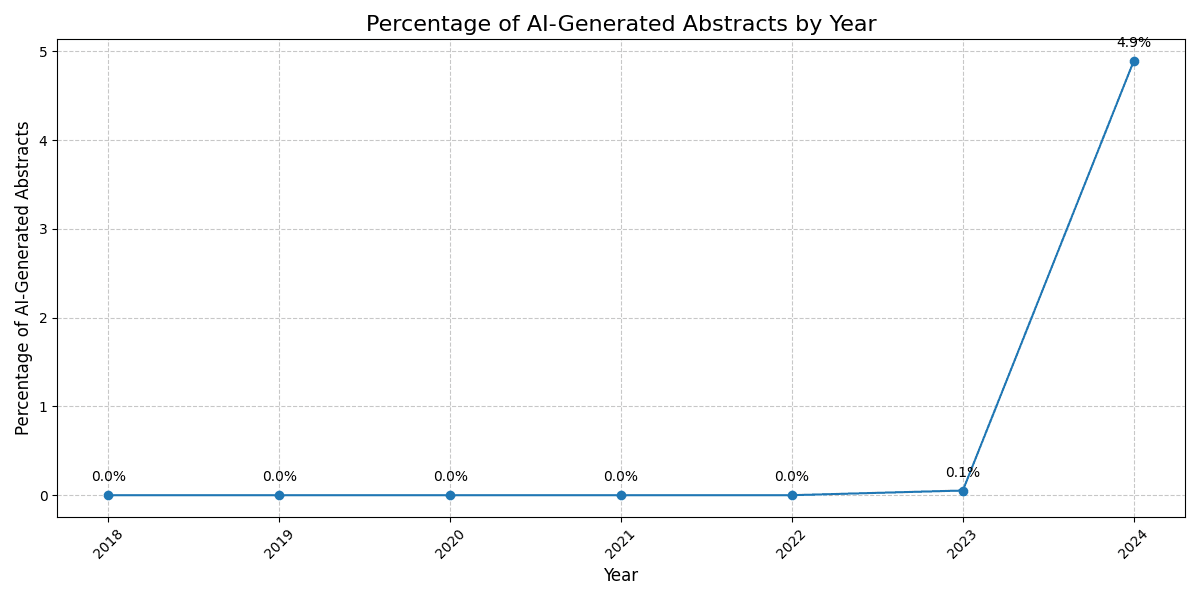 A chart depicting the percentage of AI-generated abstracts submitted to Neurips by year, revealing an upward trend since 2023.