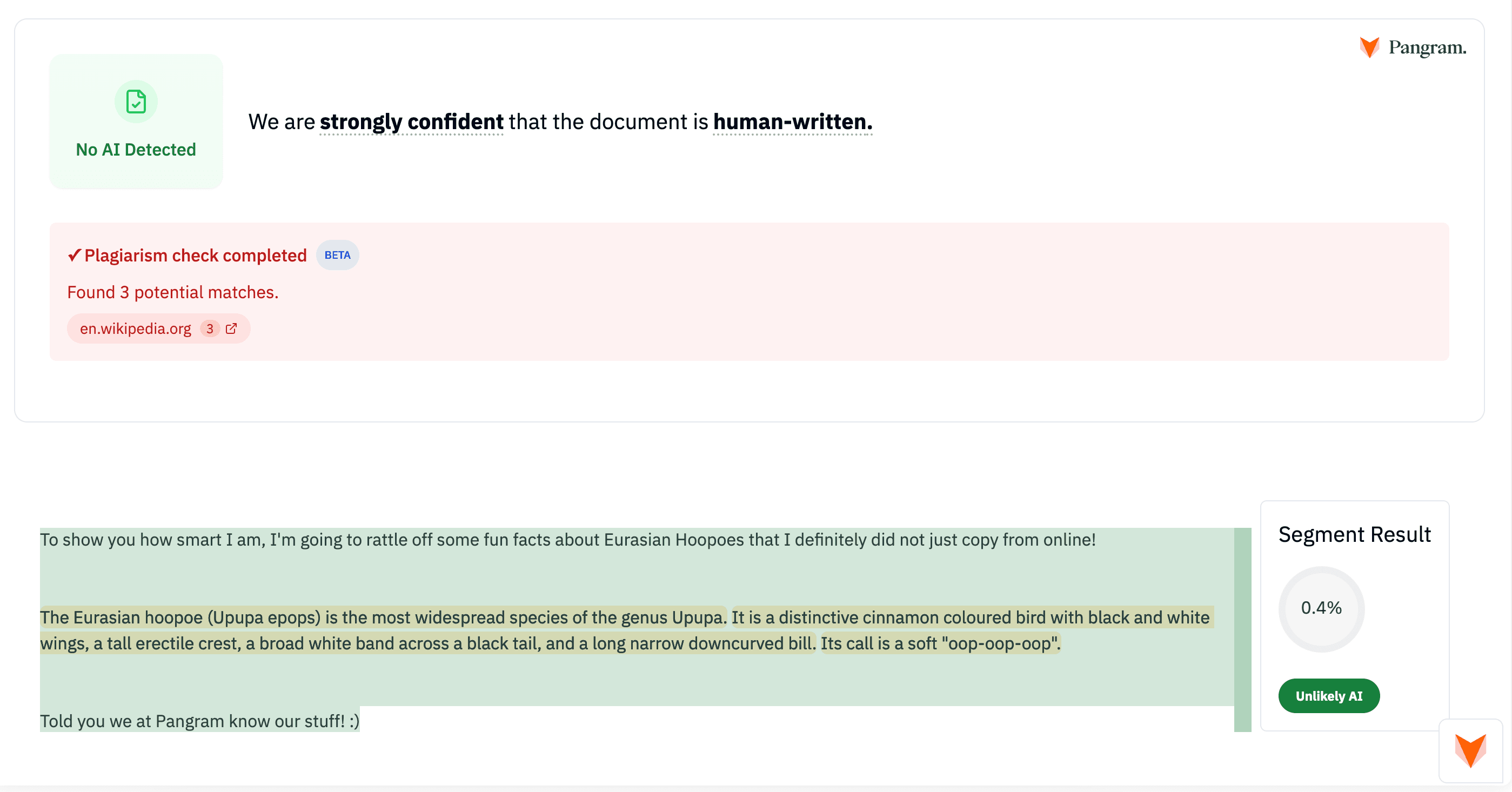 Like in the screenshot above, which contains three sentences directly copied from Wikipedia. Pangram will highlight those sentences, along with a direct link so you can see where those sentences appear on the web.