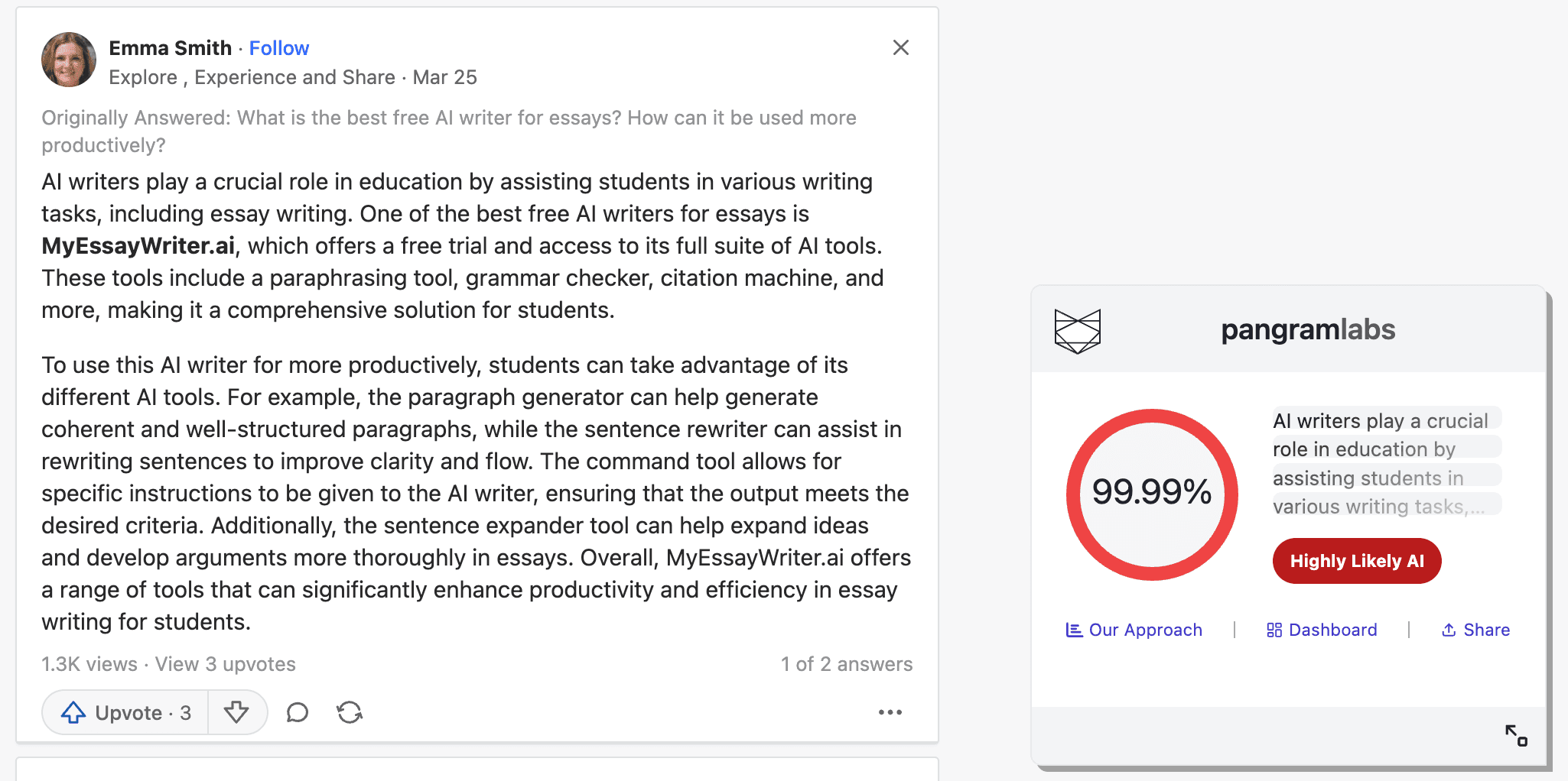 In April 2024, Pangram Labs partnered with Quora to help them take on spammers using ChatGPT to respond to posts with inauthentic, AI-generated answers.