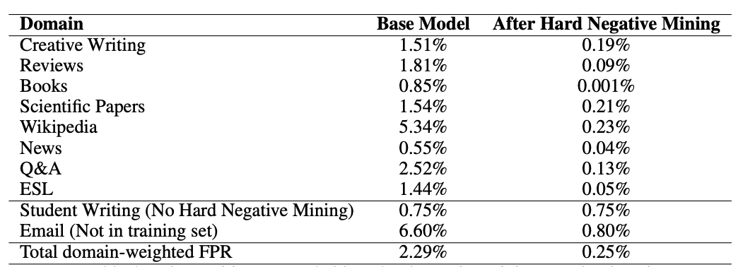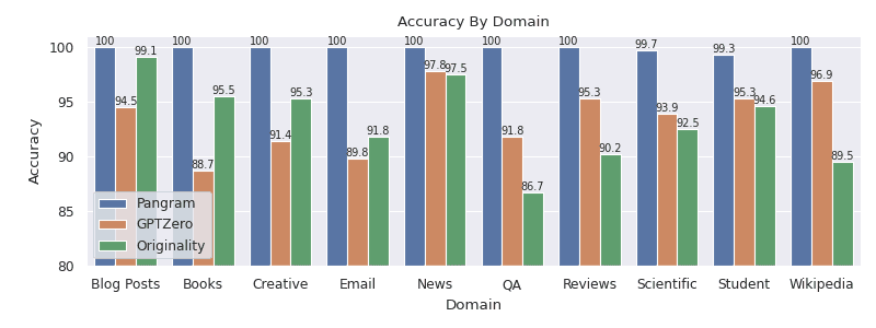 One of the domains, email, is an especially strong result because Pangram Labs does not include any email in its training data. Our performance on email is driven entirely by training a robust model that generalizes to most categories of writing that an LLM can produce.