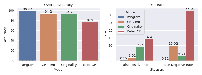 In our technical report, we compared Pangram Labs against the two leading AI detection tools, as well as a 2023 state-of-the-art academic method for AI detection.