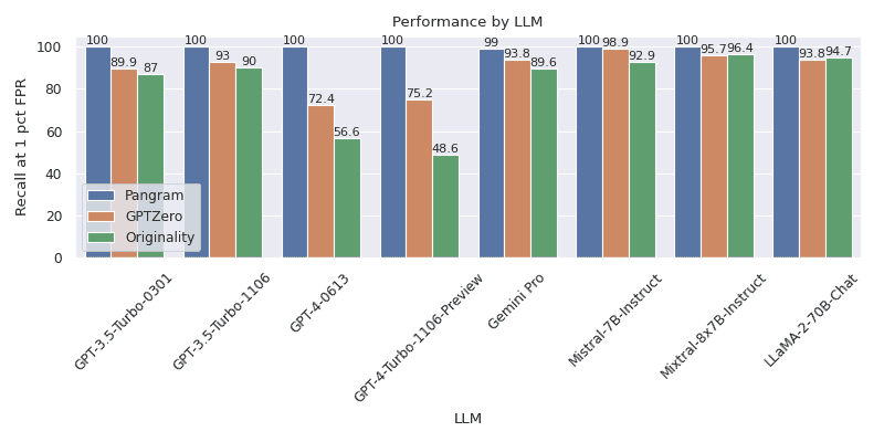 Performance by open source LLM, unseen by Pangram Labs during training.
