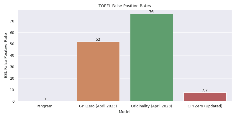 We held out the 91 TOEFL essays from our training set and evaluated Pangram Labs on the benchmark. Due to our work minimizing false positive rates for ESL, we report a false positive rate of 0% on the TOEFL benchmark - meaning none of the human essays in this benchmark were misclassified as AI.